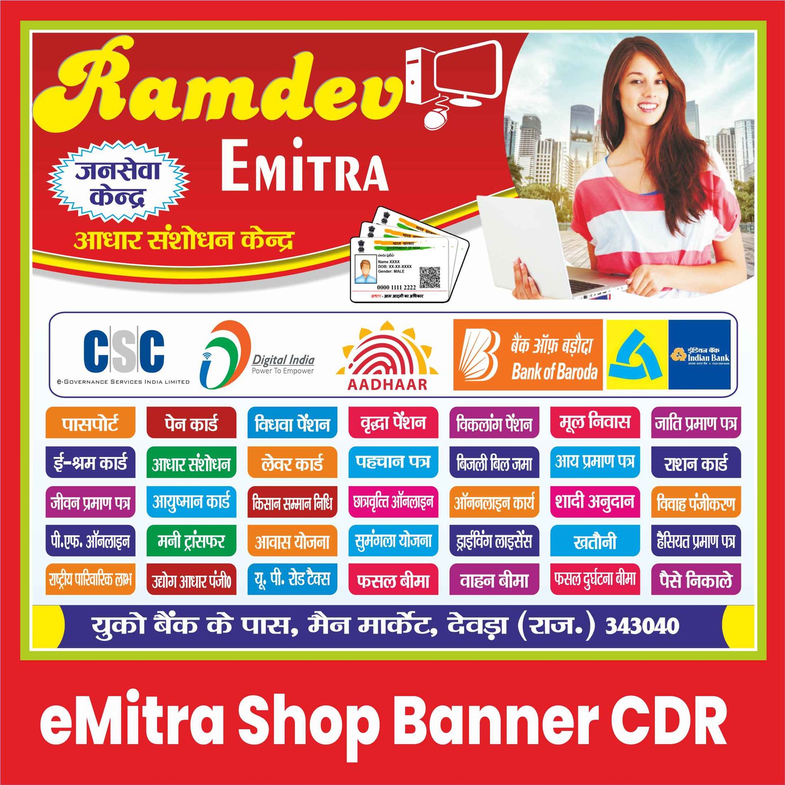 Emitra Shop Banner CDR File Download एक professional flex banner design template है जिसे खासतौर पर Rajasthan Emitra centers, CSC centers और online service shops के लिए बनाया गया है।